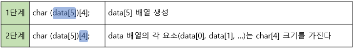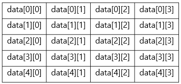 char data1, data2, data3, data4; // 4개의 변수를 개별적으로 선언함 char data[4]; // 4개의 변수를 묶어 1차원 배열로 선언함 // 1차원 배열을 5개 묶으려면? char data1[4], data2[4], data3[4], data4[4], data5[4]; char data[5][4]; //4개짜리 그룹이 5개 있는것char data[4][5]가 아니라, char data[5][4]로 적는 이유는?